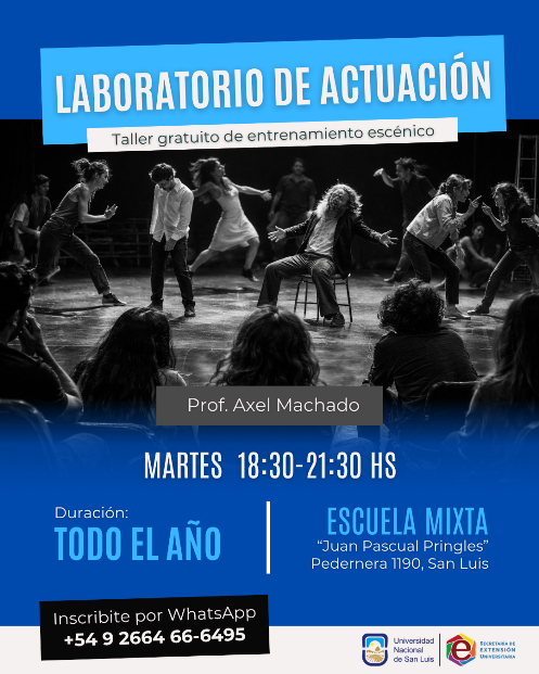 Objetivos: Un espacio de formación y entrenamiento escénico orientado a personas interesadas en profundizar el trabajo actoral. La propuesta está dirigida a quienes deseen explorar el lenguaje teatral desde una perspectiva práctica, comprometida y de búsqueda artística. El trabajo se desarrollará a partir del entrenamiento actoral, la improvisación y la creación de escenas, abordando diferentes aristas de las técnicas actorales. La propuesta abarca la investigación, el proceso y desarrollo expresivo, priorizando el trabajo sostenido y el compromiso con la práctica. Responsable: Prof. Axel Machado Sede: Escuela Normal Mixta Juan Pascual Pringles, Pedernera 1190, San Luis. Destinatarios: Personas mayores de 18 años (con o sin experiencia previa) Inicio: 14/04/26 Arancel: Gratuito Duración: Anual - martes de 18:30 a 21:30 hs Consultas:+54 9 2664 66-6495 Inscribirse
