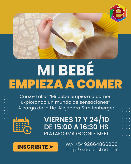 Objetivos: Orientar a padres, cuidadores, familiares, personal de jardines maternales y guarderías, para lograr una alimentación complementaria exitosa. Estimular la alimentación perceptiva, brindando herramientas para identificar conductas propicias a la autorregulación de la comida. Potenciar la correcta y oportuna inclusión de texturas y sabores el desarrollo de una alimentación completa, minimizando el rechazo a alimentos y favoreciendo los procesos del desarrollo de masticación y estructuras asociadas. Responsable: Lic. Alejandra Streitenberger Sede: Plataforma Google Meet Destinatarios: Público General Inicio: 17/10/25 Arancel: $22.000 (público general) / $20.000 (comunidad UNSL) Duración: 2 encuentros - 17 y 24 de octubre de 15 a 16:30 hs Consultas:+54 9 266 486-6066 Inscribirse