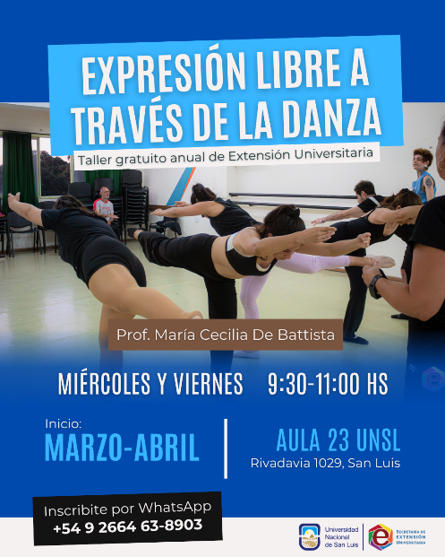 Objetivos: Esta formación anual tiene por objetivo: generar un espacio de encuentro y exploración corporal donde, a través de la danza y el movimiento libre, los participantes puedan conectar con su cuerpo, liberar tensiones, estimular la creatividad y expresar emociones de manera auténtica. Responsable: Mtra. María Cecilia De Battista Sede: Aula 23, edificio Comedor UNSL, 3º piso, Rivadavia 1029, San Luis. Destinatarios: Personas de 15 a 45 años (no requiere experiencia previa) Inicio: 10/04/26 Arancel: Gratuito Duración: Anual - miércoles y viernes de 9:30 a 11:00 hs Consultas:+54 9 2664 63-8903 Inscribirse