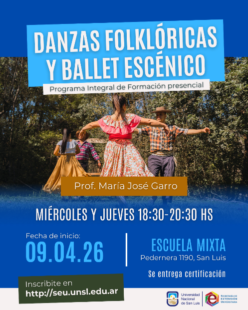 Objetivos: Brindar una formación completa y progresiva en danza folklórica tradicional argentina y en danza folklórica estilizada, que permita a los participantes adquirir los conocimientos de la teoría, la práctica y la puesta en escena en el desarrollo técnico, expresivo, creativo y escénico. Responsable: Prof. Superior de Danzas Folklóricas María José Garro Sede: Escuela Normal Mixta Juan Pascual Pringles, Pedernera 1190, San Luis. Destinatarios: Público General Inicio: 09/04/26 Arancel: $20.000 por mes Duración: 8 meses - miércoles y jueves de 18:30 a 20:30 hs Consultas:+54 9 2664 501633 Inscribirse