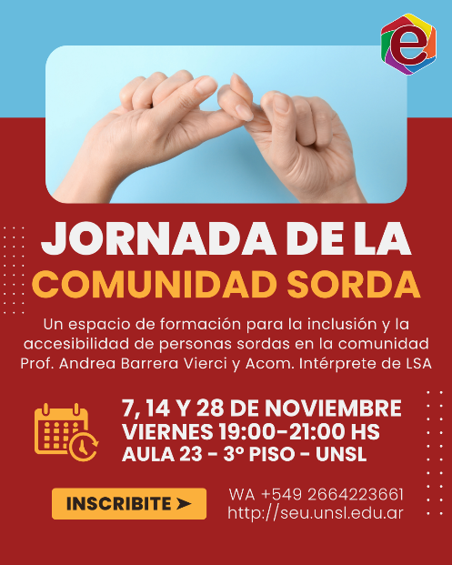 aprender juntas. Responsable: Prof. Andrea Barrera Vierci y Acom. Intérprete de LSA Sede: Aula 23, Rivadavia 1029, 3º piso, edificio Comedor Universitario, San Luis. Destinatarios: Público General Inicio: 07/11/25 Arancel: $20.000 Duración: 3 encuentros - 7, 14 y 28 de noviembre de 19 a 21 hs Consultas:+54 9 266 422-3661 Inscribirse