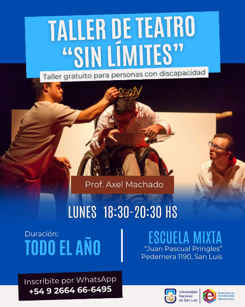Objetivos: Por 6° año consecutivo, se abre la convocatoria al taller SIN LÍMITES, un espacio de teatro destinado a personas con discapacidad donde el arte se convierte en una herramienta de expresión, encuentro y participación. Este taller propone un trabajo desde el cuerpo, la improvisación y la construcción de escenas, generando experiencias teatrales y actorales que fortalecen la comunicación, el vínculo con otros y la presencia en escena. Un espacio donde cada participante puede expresarse, ser escuchado y formar parte de una experiencia artística real. Responsable: Prof. Axel Machado Sede: Escuela Normal Mixta Juan Pascual Pringles, Pedernera 1190, San Luis. Destinatarios: Personas con discapacidad (Entrevista previa con el docente) Inicio: 13/04/26 Arancel: Gratuito Duración: Anual - lunes de 18:30 a 20:30 hs Consultas:+54 9 2664 66-6495 Inscribirse
