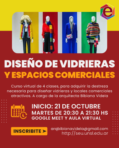 Objetivos: Profundizar sobre la funcionalidad del diseño de los espacios comerciales y vidrieras, mediante la prefiguración de espacios, equipamiento, estética, usos, etc. Promover el análisis y estudio de la espacialidad. Elaborar proyectos funcionales y de calidad que incluyan al cliente. Lograr que los alumnos adquieran la destreza necesaria para diseñar vidrieras y locales comerciales atractivos que ayuden a aumentar las ventas y mejorar la imagen de la marca. Generar diseños que puedan construir espacios que cuenten historias e inviten a los clientes a sumergirse en ellos y desear adquirir sus productos. Capacitar a los estudiantes en la construcción de ambientes que aporten singularidad y elegancia a partir del diseño. Comprender la importancia de un buen diseño en el ámbito comercial y la influencia que posee sobre el arte de diseñar para atraer clientes, aumentar las ventas y mejorar la imagen de la marca, ya que las vidrieras son el primer contacto que tienen los clientes con una marca. Estudiar los espacios comerciales y su impacto en hábitos de consumo para lograr establecer el mejor posicionamiento de la marca. Responsable: Arq. Bibiana Videla Sede: Plataforma Google Meet Destinatarios: Público General Inicio: 21/10/25 Arancel: $25.000 (pago único) Duración: 4 clases - martes de 20:30 a 21:30 hs Consultas:arqbibianavidela@gmail.com Inscribirse